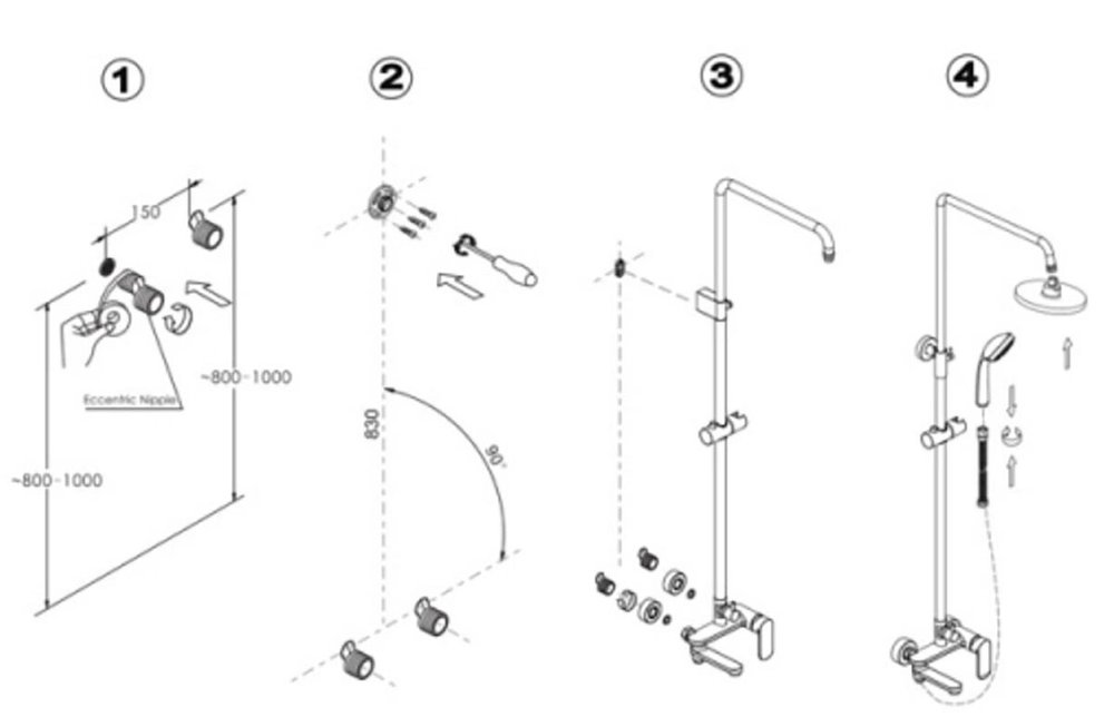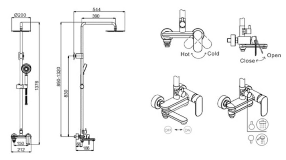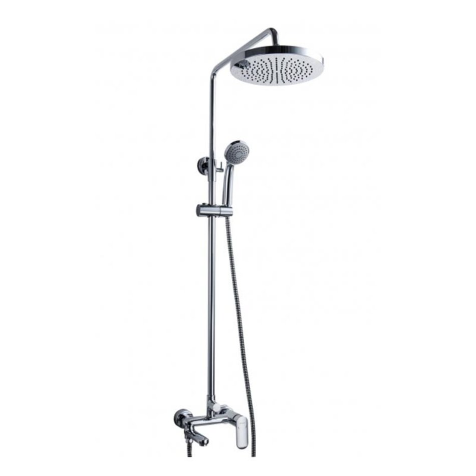 - В комплекте: смеситель, душевая стойка, лейка, шланг, держатель