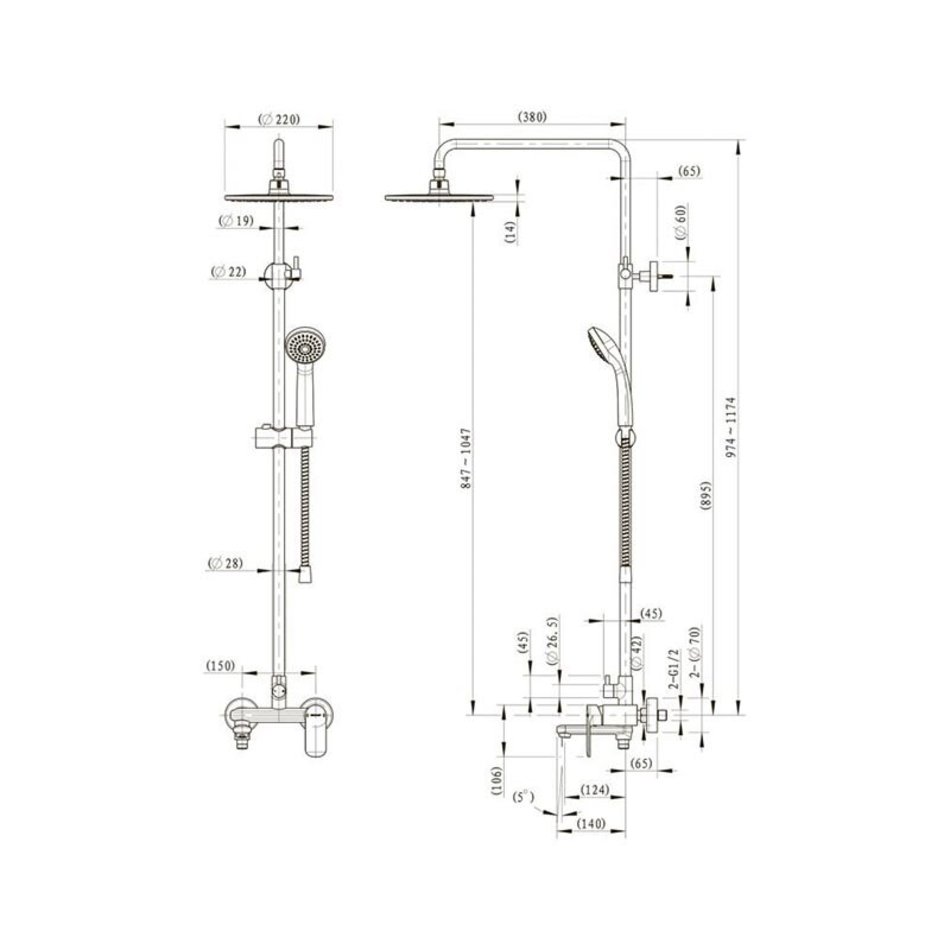 - В комплекте: смеситель, душевая стойка, лейка, шланг, держатель