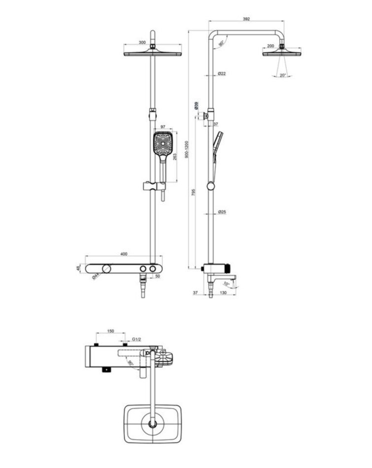 - душевой набор (тропический душ, лейка, рейлинг, душевой шланг в PVC оплетке 1/2", 150см).