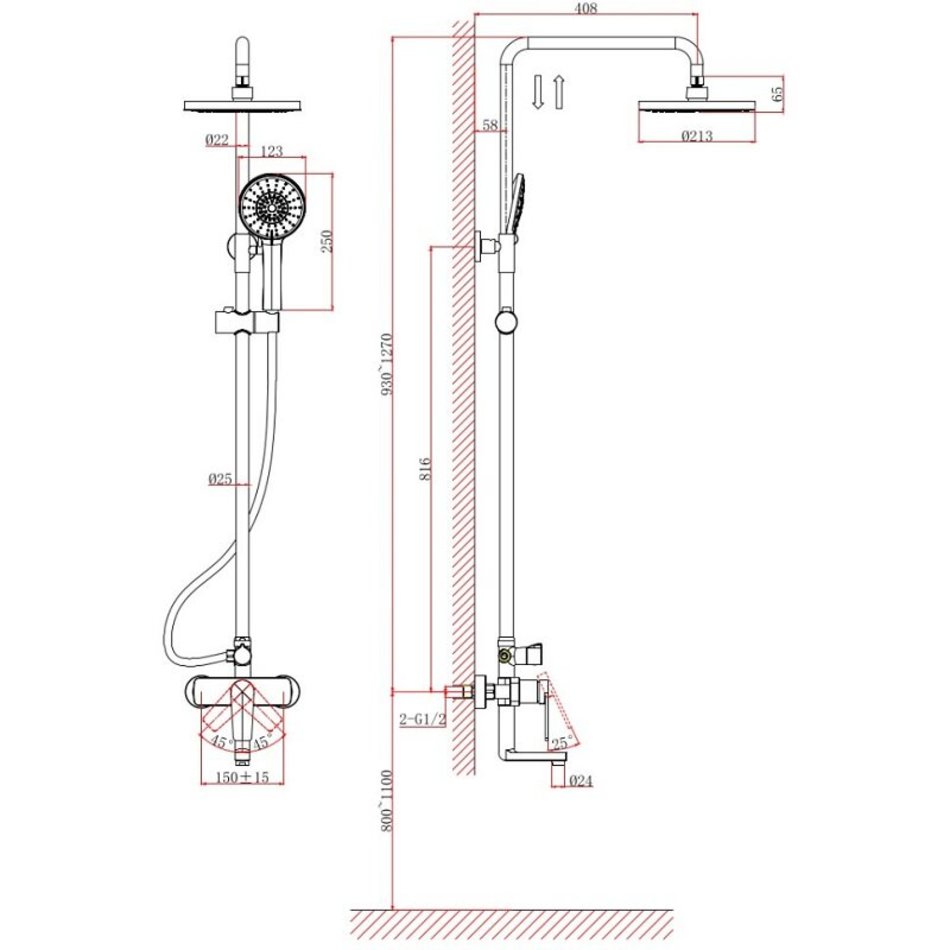 - Душевая штанга регулируется по высоте: 930-1270 мм.