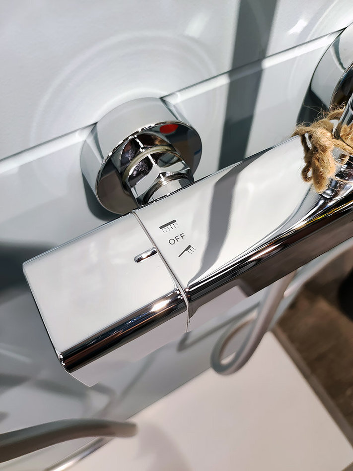 - Максимальная безопасность: термостатический картридж 35 мм обеспечивает точную настройку температуры и напора воды. Благодаря телескопической штанге с диапазоном регулировки в 400 мм водные процедуры будут одинаково комфортны абсолютно для всех членов семьи. Выставляйте комфортные для вас параметры легким поворотом правой ручки смесителя.