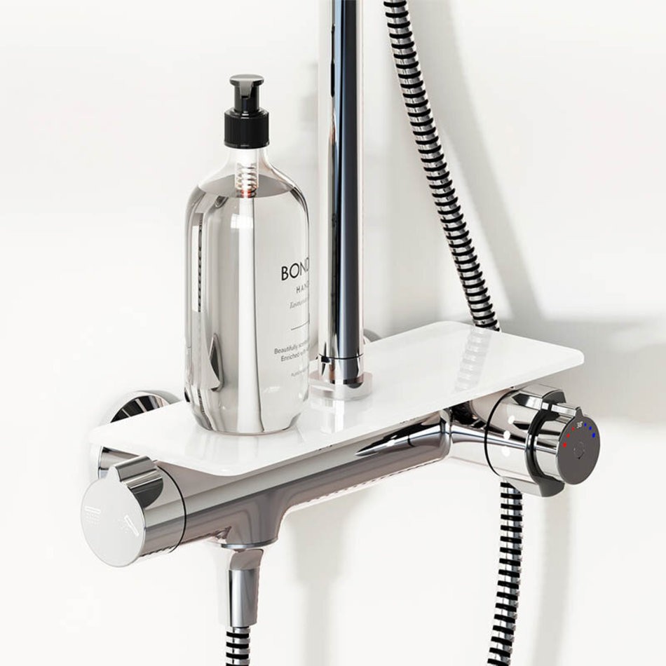 Непревзойдённый комфорт и удобство: смеситель выполнен в виде компактной полочки из закаленного стекла, где вы можете хранить все необходимые вещи. Благодаря телескопической штанге с диапазоном регулировки 400 мм ежедневные процедуры будут одинаково комфортны для людей любого роста. Большое количество форсунок с микроотверстиями, которые распределяют поток мягкими равномерными струями, обеспечит вам расслабляющий эффект настоящего домашнего SPA. Переключайте потоки воды между ручной и тропической лейками плавным поворотом левой ручки смесителя. Угол наклона тропической лейки можно регулировать. Инновационное покрытие High Gloss надежно защищает хромовую поверхность душевой системы от мелких повреждений и сохраняет ювелирный блеск на долгие годы.