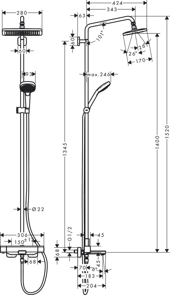Душевая система Hansgrohe Croma E Showerpipe 280 1jet 27687000 c термостатом и изливом для ванны, хром