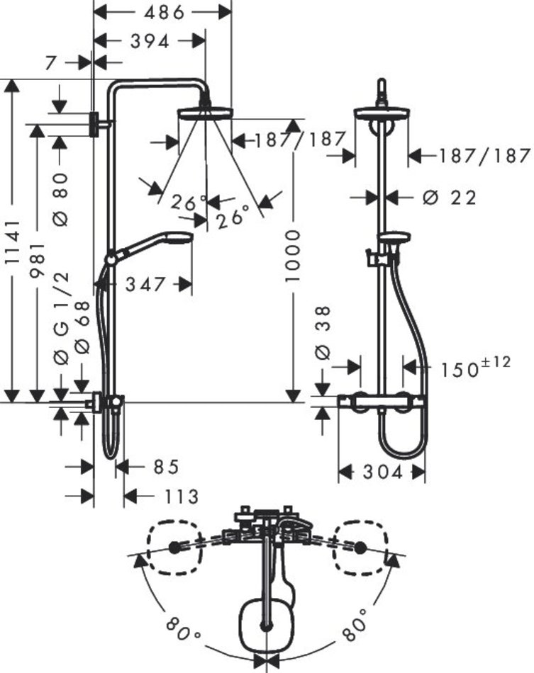 - шарнирное соединение: регулируемый угол верхнего душа