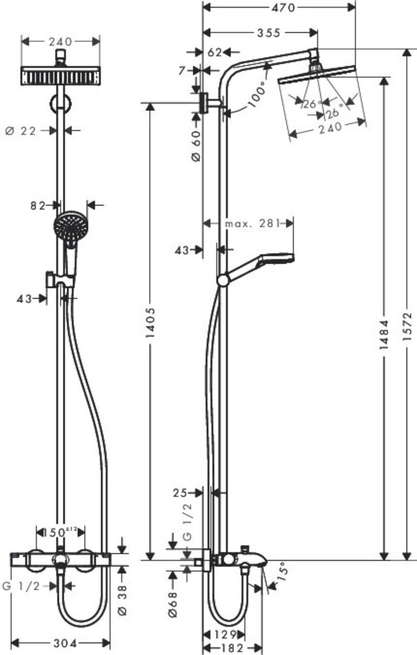 - состоит из: верхний душ, ручной душ, термостат для ванны, штанга для душа, держатель для душа, душевая штанга
