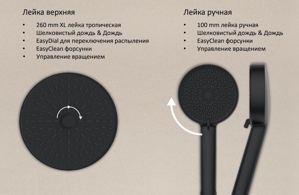 - Верхний душ: 26 см, круглый, 2 режима, управление вращением