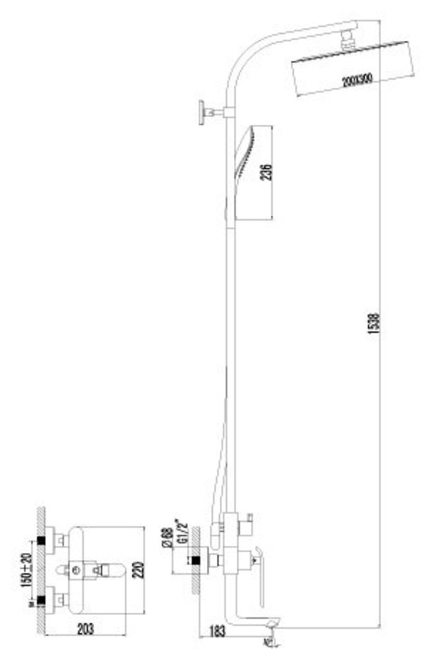 - Верхний душ: тропический, прямоугольный, 20*30 см