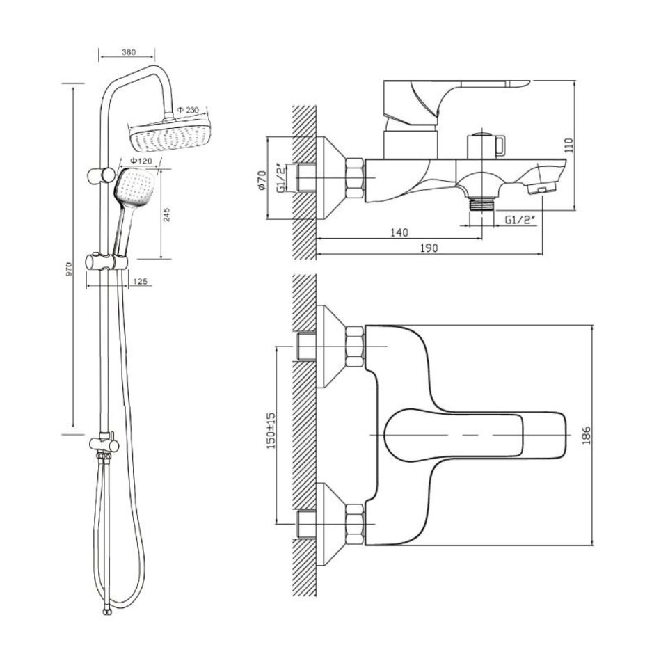 Комплектация: верхний душ, шланг для душа, смеситель с изливом, душевая лейка, душевая штанга, держатель лейки, держатель штанги, эксцентрики, инструкция