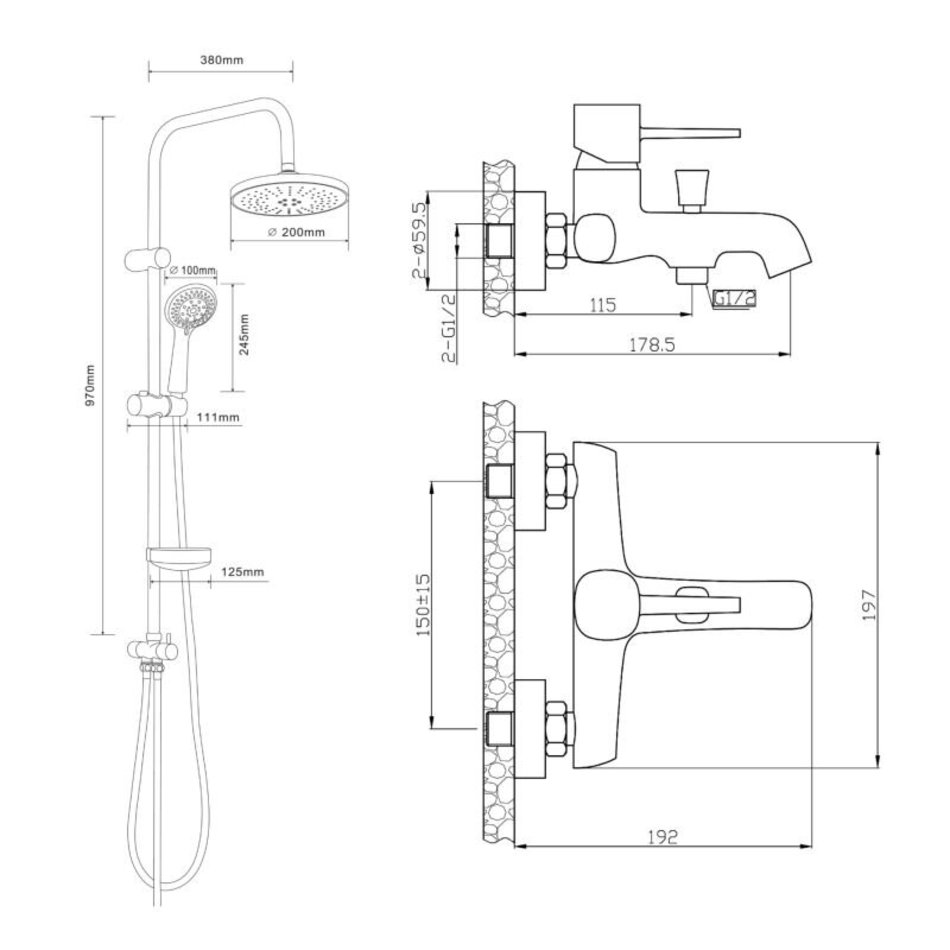 Комплектация: верхний душ, шланг для душа, смеситель с изливом, душевая лейка, душевая штанга, держатель лейки, держатели штанги, эксцентрики, мыльница, инструкция
