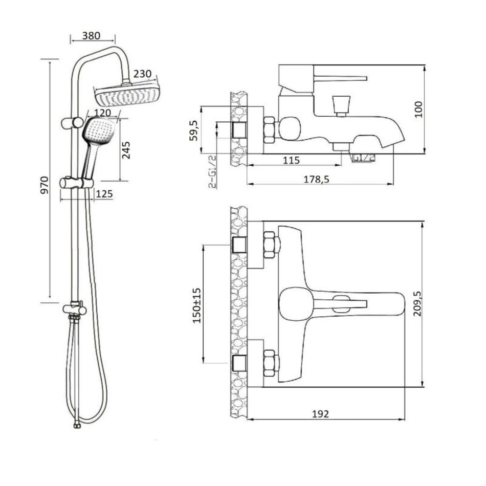 Комплектация: верхний душ, шланг для душа, смеситель с изливом, душевая лейка, душевая штанга, держатель лейки, держатели штанги, эксцентрики, инструкция