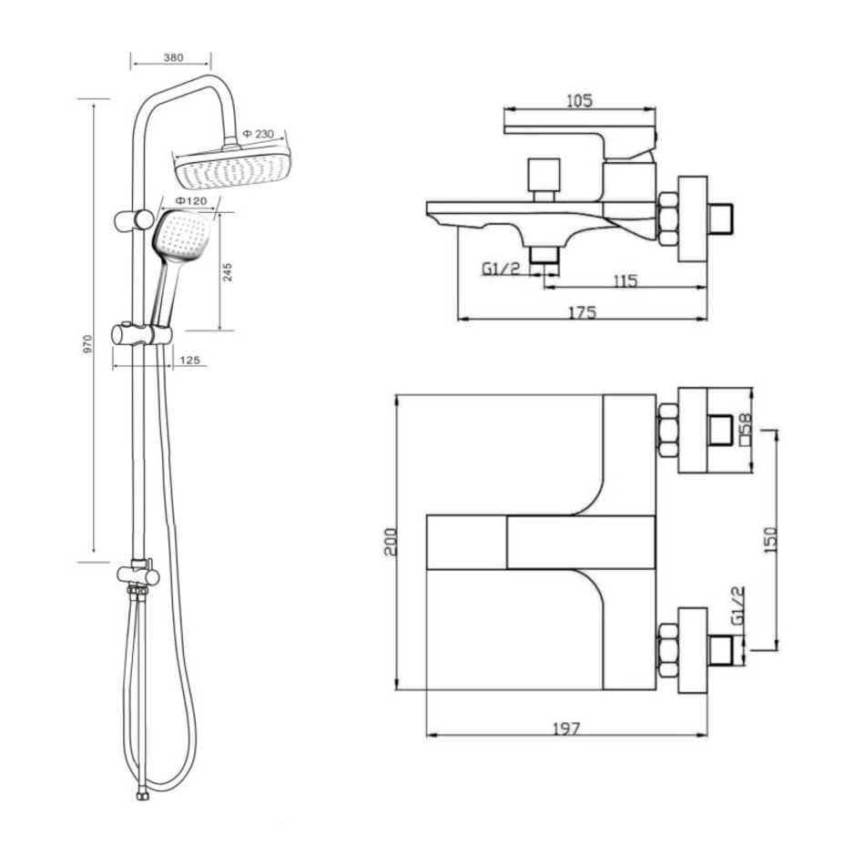 Комплектация: верхний душ, шланг для душа, смеситель с изливом, душевая лейка, душевая штанга, держатель лейки, держатели штанги, эксцентрики, инструкция