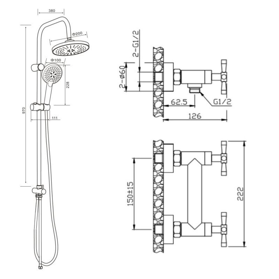 Комплектация: верхний душ, шланг для душа, смеситель, душевая лейка, душевая штанга, держатель лейки, держатель штанги, эксцентрики, инструкция