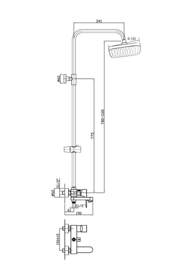 Комплектация: верхний душ, шланг для душа, смеситель с изливом, душевая лейка, душевая штанга, держатель лейки, держатель штанги, эксцентрики, инструкция
