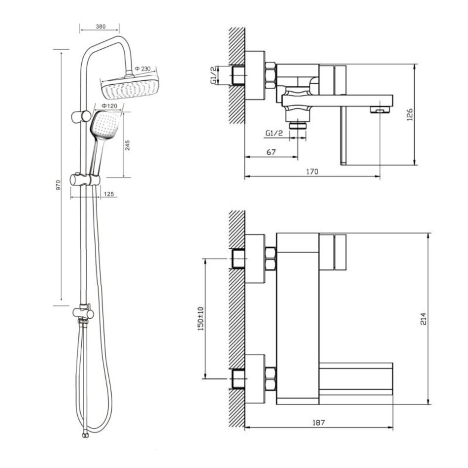 Комплектация: верхний душ, шланг для душа, смеситель с изливом, душевая лейка, душевая штанга, держатель лейки, держатели штанги, эксцентрики, инструкция