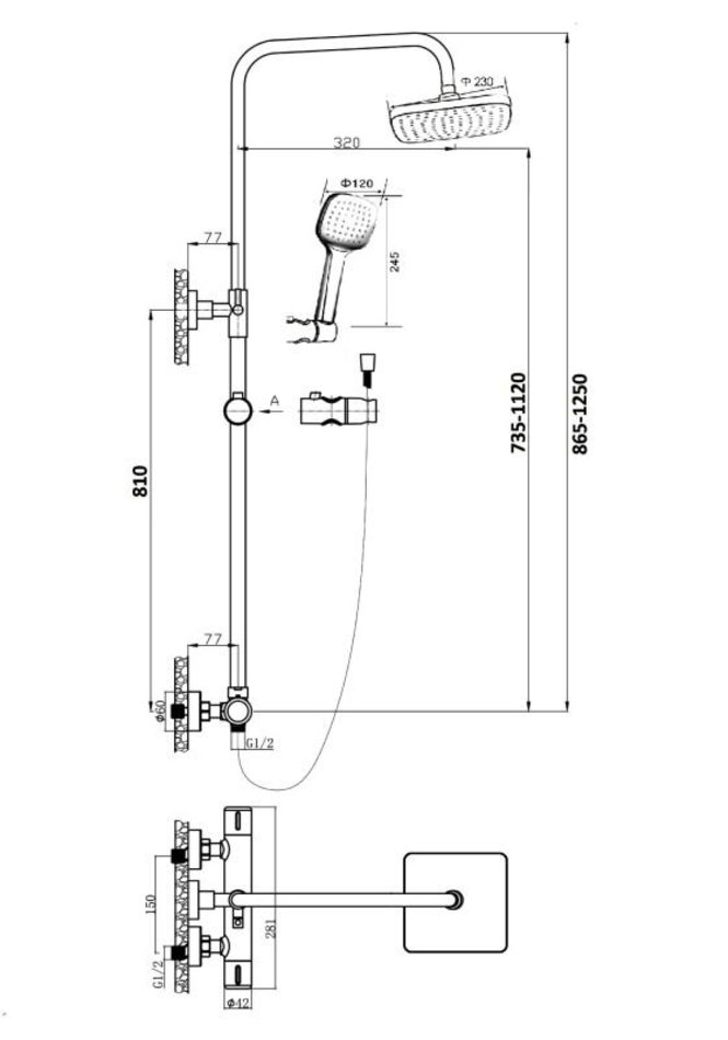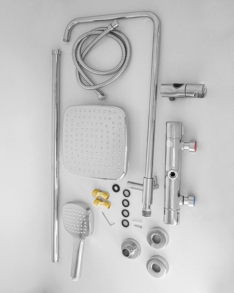 Комплектация: верхний душ, шланг для душа, термостат, душевая лейка, душевая штанга, держатель лейки, держатель штанги, эксцентрики, инструкция