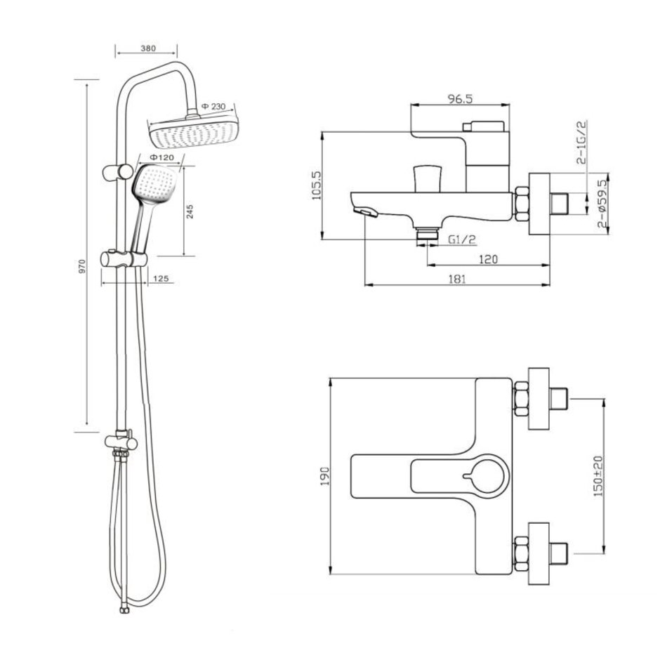 Комплектация: верхний душ, шланг для душа, термостат с изливом, душевая лейка, душевая штанга, держатель лейки, держатели штанги, эксцентрики, инструкция