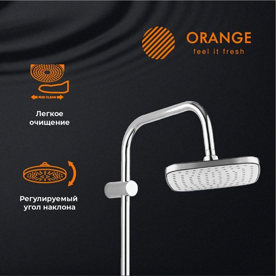 Orange T19-944cr. Душевая система в комплекте: однозахватный смеситель для ванны с термостатом; верхний душ d265 мм с ситемой самоочистки, ручной душ 120 мм с режимом самоочистки, регулируемый по высоте и наклону держатель, душевой шланг 1,5 м, керамический дивертор. Штанга с возможностью установки в старые отверстия, цвет: хром