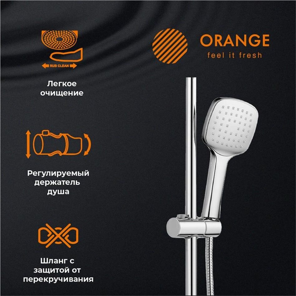 Душевая система Orange Thermo: термостат для ванны/душа - поддерживает температуру воды во время работы за счет смешивания горячих и холодных потоков в нужных пропорциях. Материал латунь. Встроенный аэратор исключает разбрызгивание и экономит воду, обогащая ее воздухом. Блеск поверхности обеспечивает покрытие хром, за которым очень просто ухаживать мягкой салфеткой; верхний душ 230х230 мм с регулировкой угла наклона, ручной душ 120 мм - 1 режим струи, регулируемый по высоте и наклону держатель ручного душа, форсунки верхнего и ручного душа с функцией легкой очистки от известкового налета, душевой шланг 1,5 м с защитой от перекручивания (в металлической оплетке), штанга 970 мм с возможностью установки в старые отверстия, керамический дивертор. Цвет глянцевый хром.
