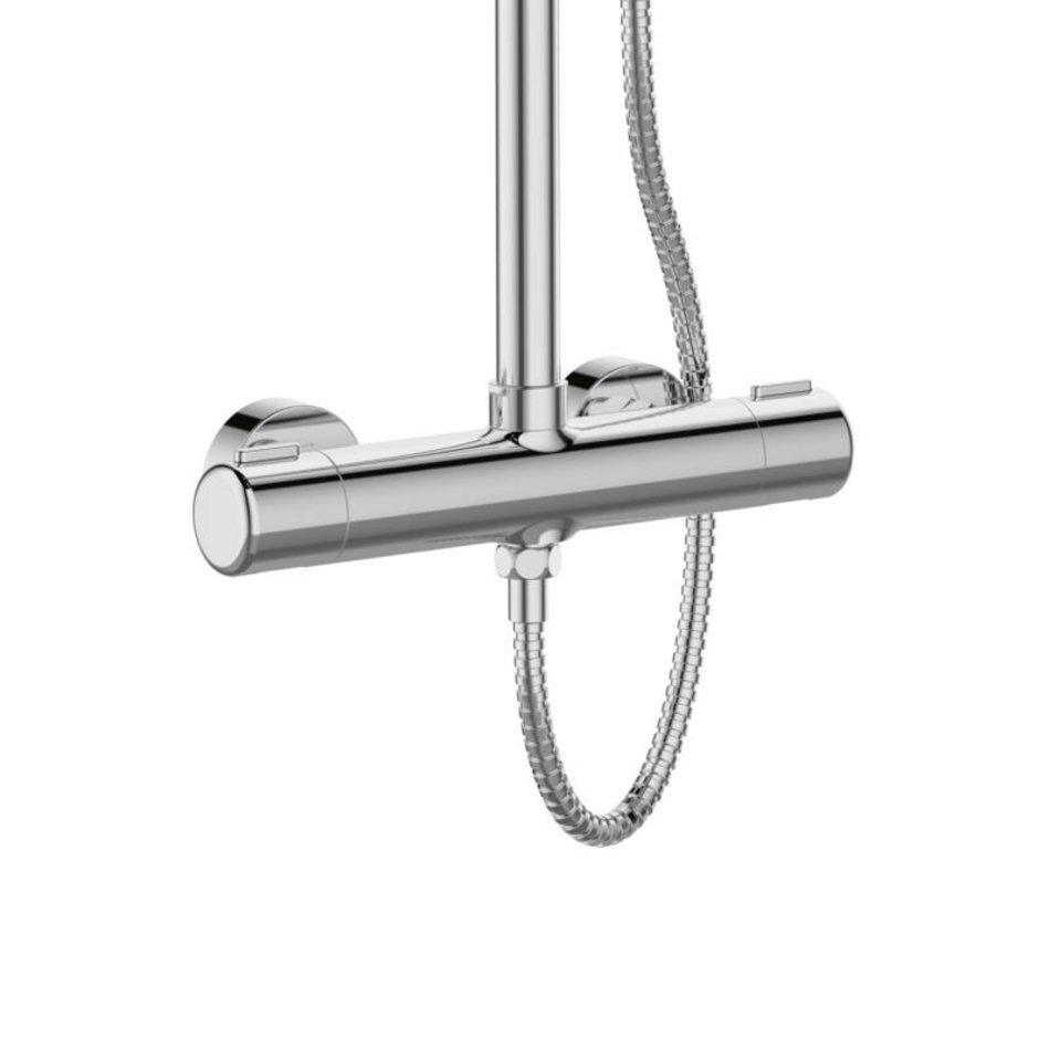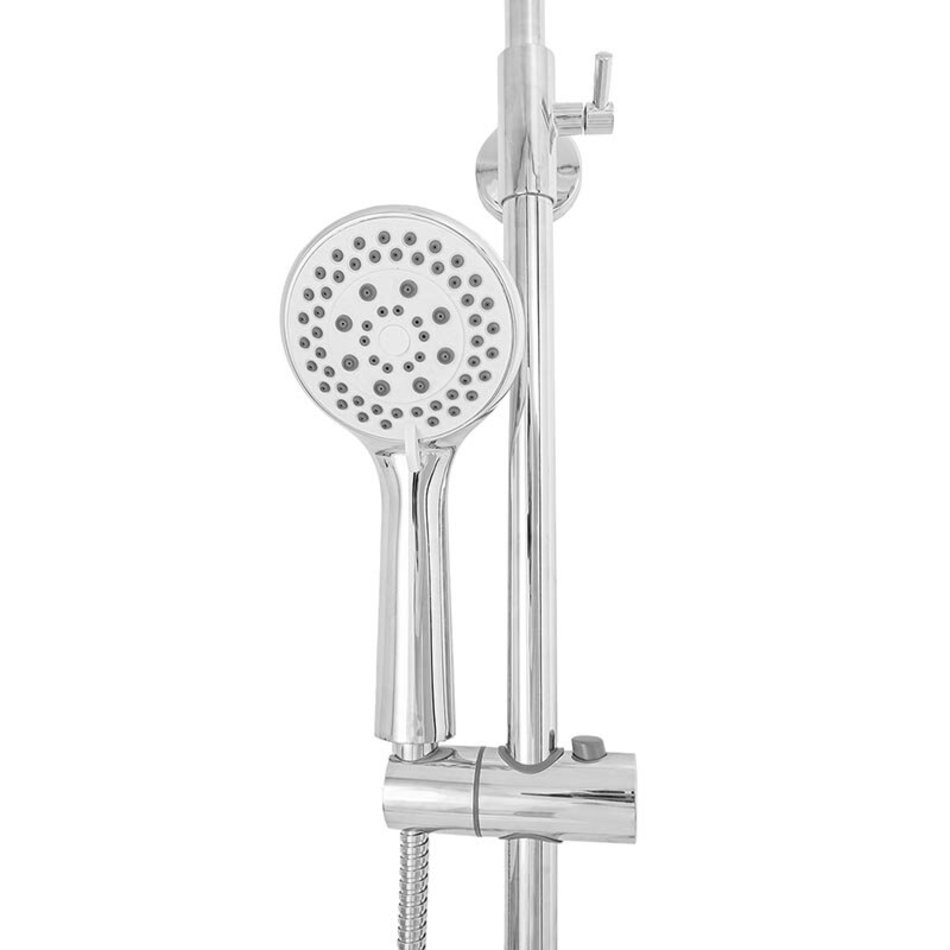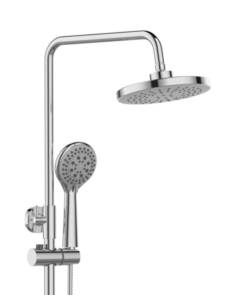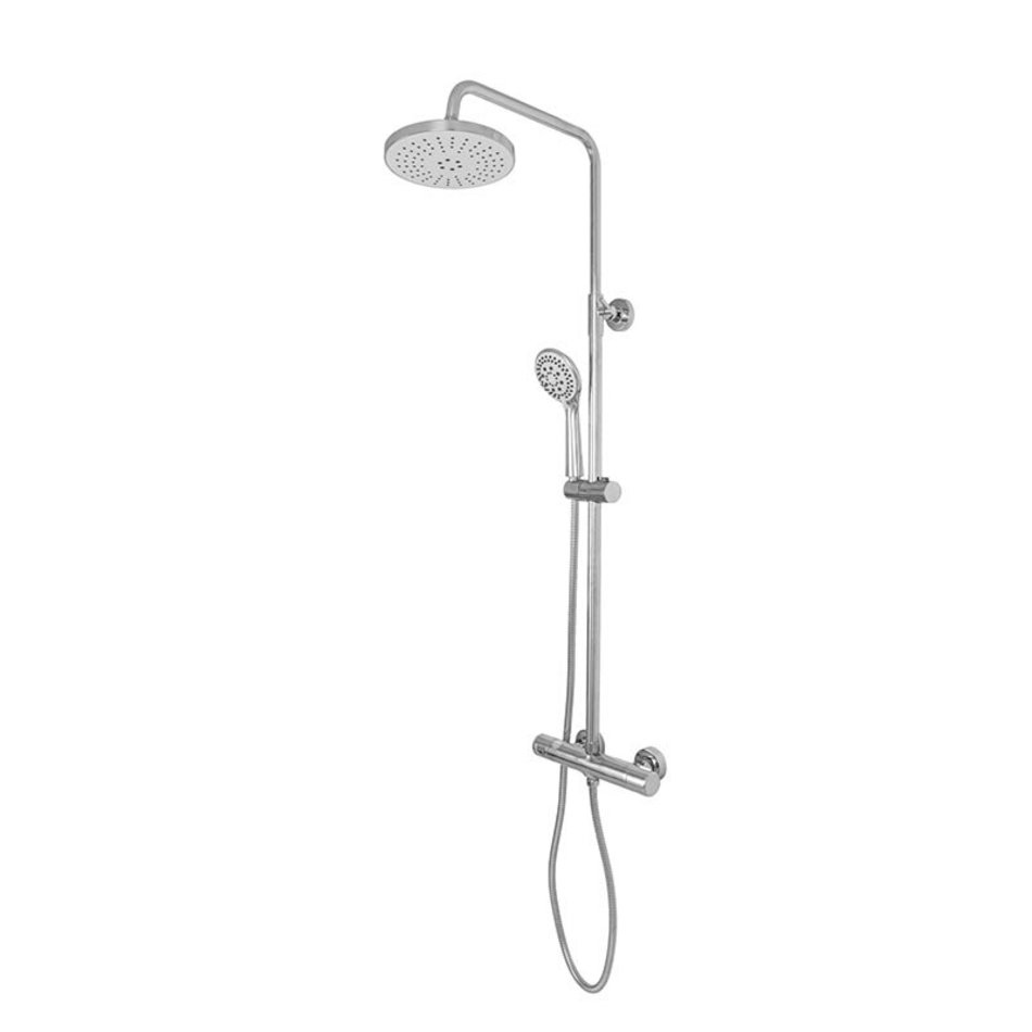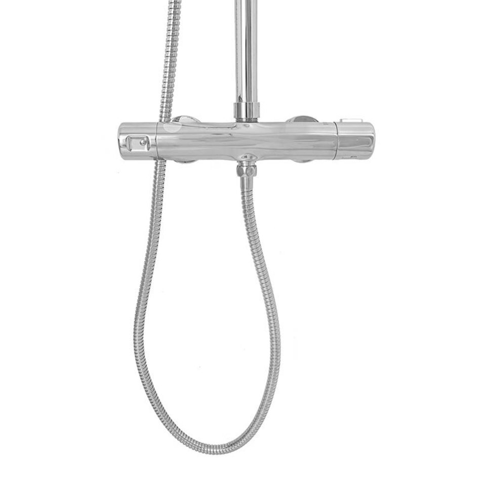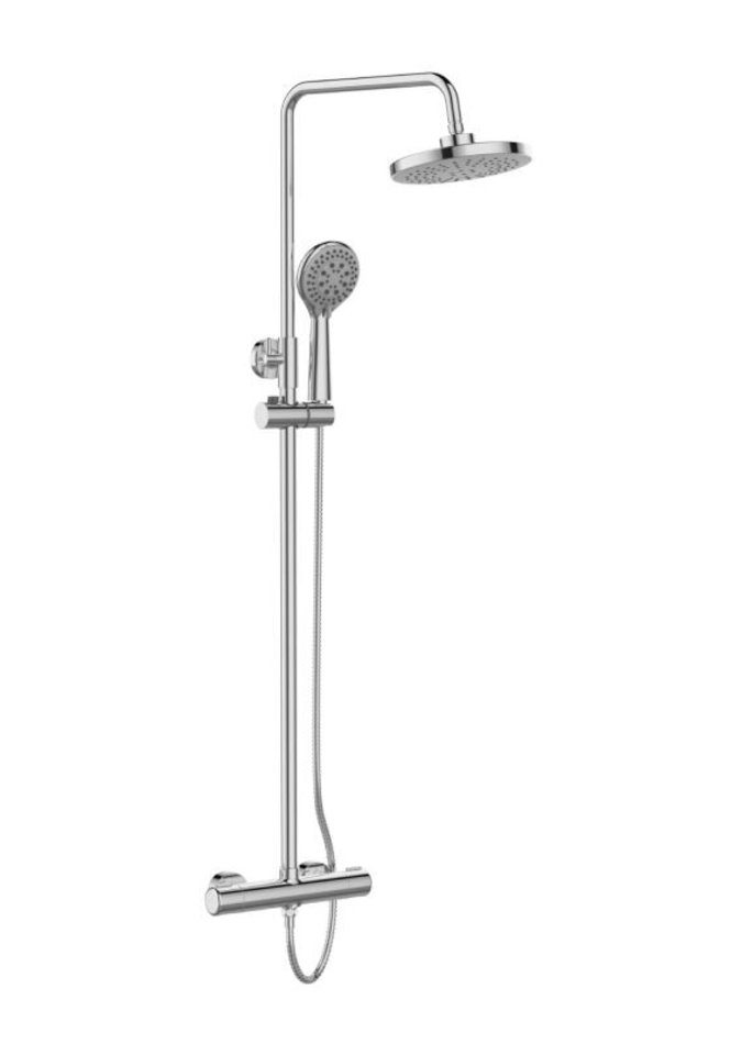 Orange T02S3-912cr Душевая система c термостатом в комплекте: смеситель с термостатом без излива, телескопическая штанга, двухрежимный верхний душ 200 мм с регулируемым углом наклона и силиконовыми форсунками, многофункциональный ручной душ, регулируемый по высоте держатель; шланг 1500 мм в металлической оплетке.