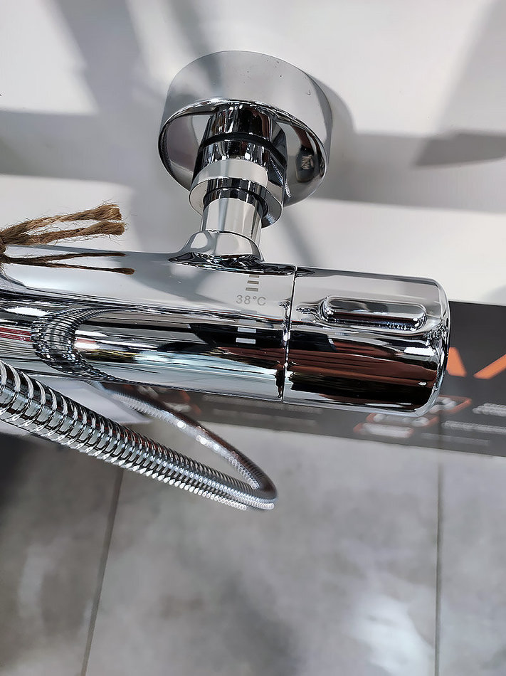 Комплектация: верхний душ, шланг для душа, термостат, душевая лейка, душевая штанга, держатель лейки, держатель штанги, эксцентрики, инструкция