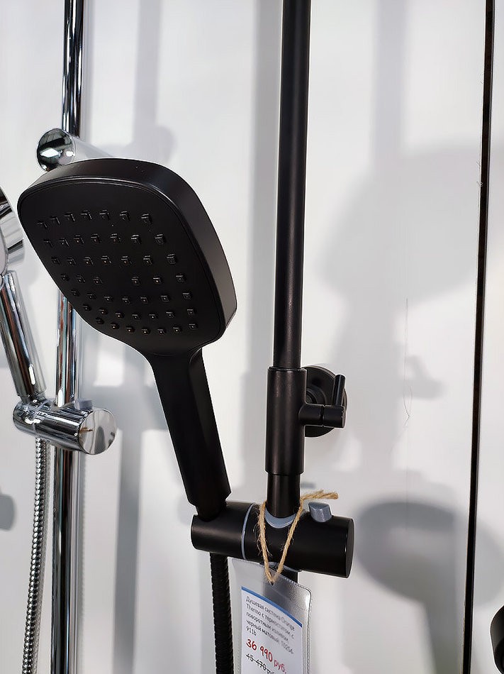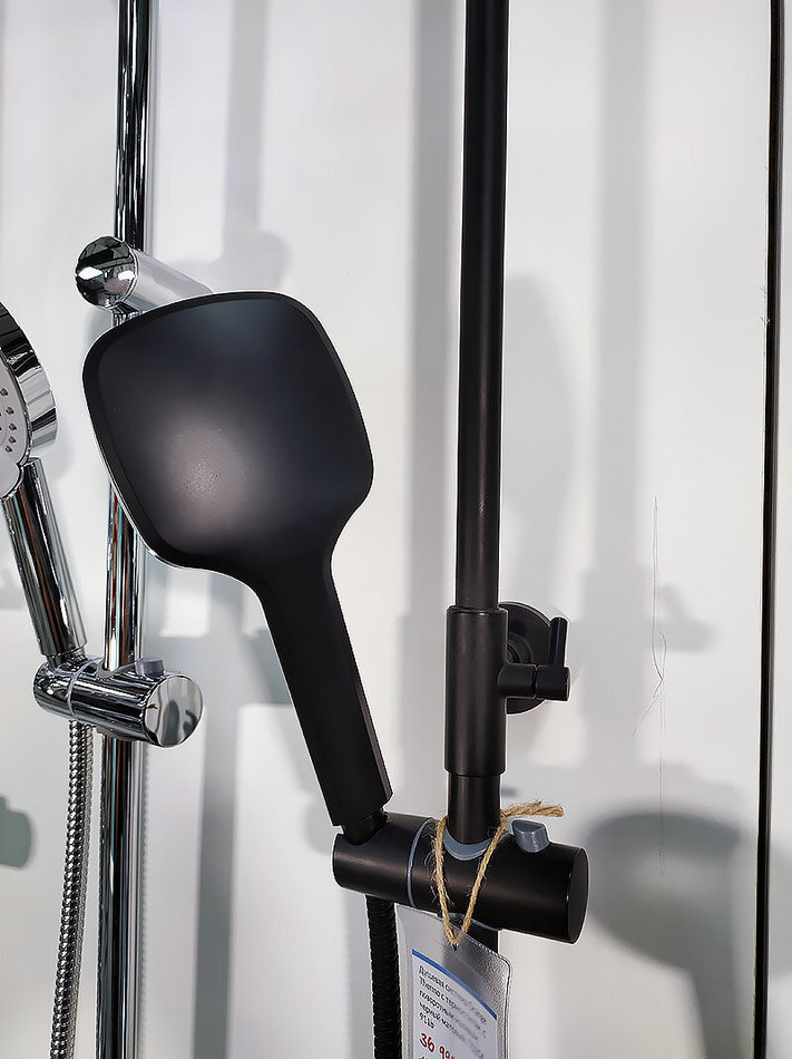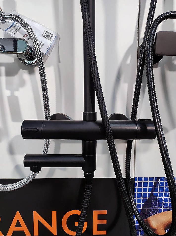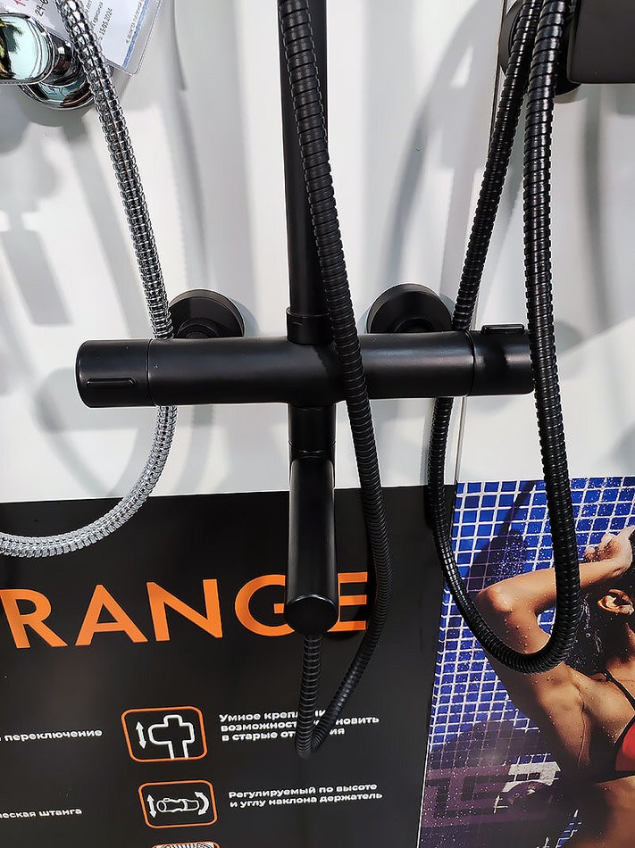 Душевая система Orange Thermo: термостат с поворотным изливом 118 мм (управление осуществляется с помощью двух стильных ручек: левая - регулирует напор воды, правая - управляет температурой, создавая идеальные условия для принятия водных процедур), телескопическая штанга 865-1250 мм, верхний душ (230х230 мм) с регулировкой угла наклона и силиконовыми форсунками (защита от известкового налета), ручной душ d 120 мм (1 режим), регулируемый по высоте и углу наклона держатель ручного душа, шланг 1500 мм в металлической оплетке (с защитой от перекручивания). Цвет матовый черный, за которым просто ухаживать мягкой салфеткой, получен порошковой окраской с многоступенчатой системой подготовки и высокотемпературной обработкой.