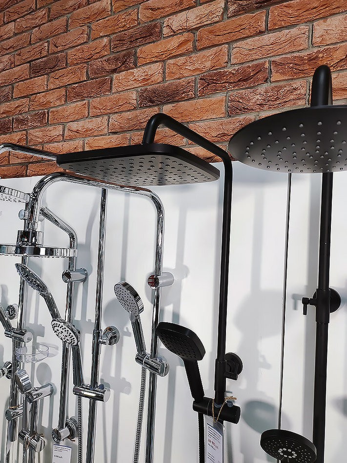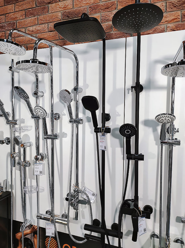 Комплектация: верхний душ, шланг для душа, термостат с изливом, душевая лейка, душевая штанга, держатель лейки, держатель штанги, эксцентрики, инструкция