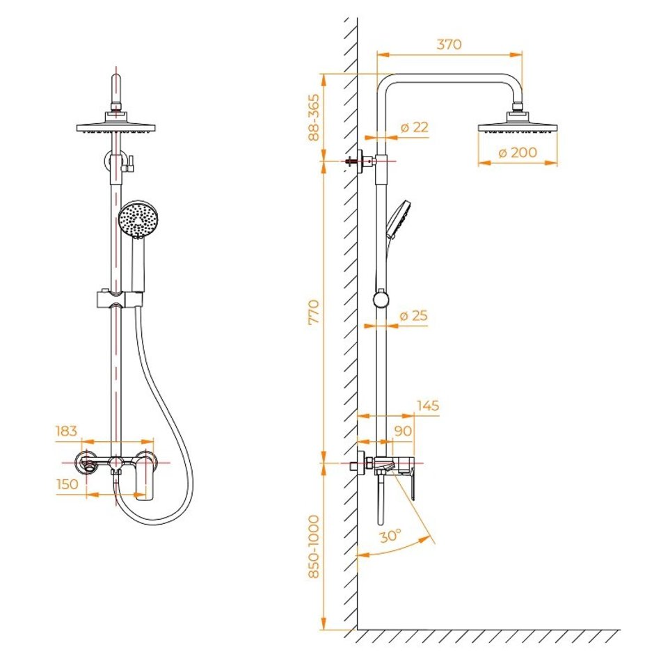 - Головной душ из высокопрочного ABS-пластика оснащён со шарнирным креплением, что позволяет выбрать необходимый угол направления воды;