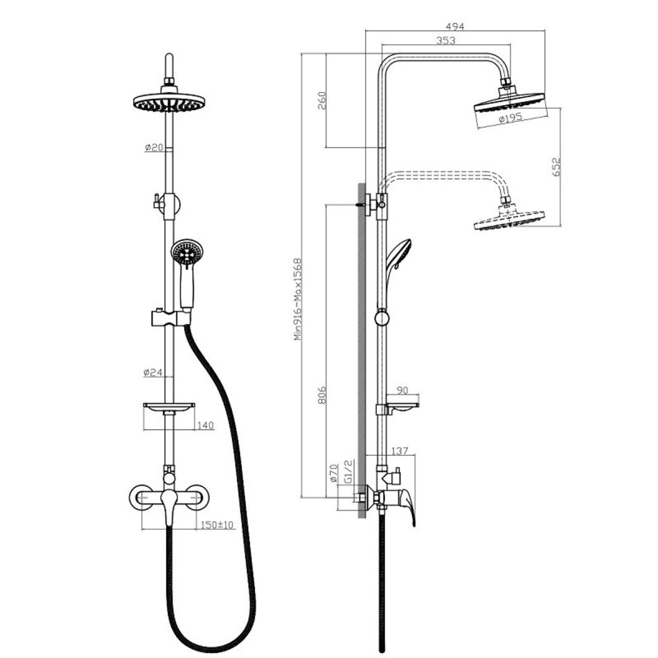 - Верхний душ: 19.5 x 19.5 см, поворотный, круглый