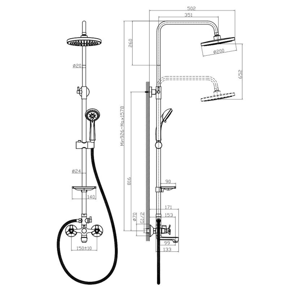 - Верхний душ: 20 см в диаметре, поворотный, круглый