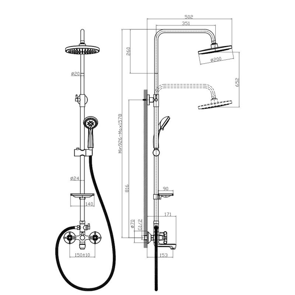 - Верхний душ: 20 x 20 см, поворотный, круглый