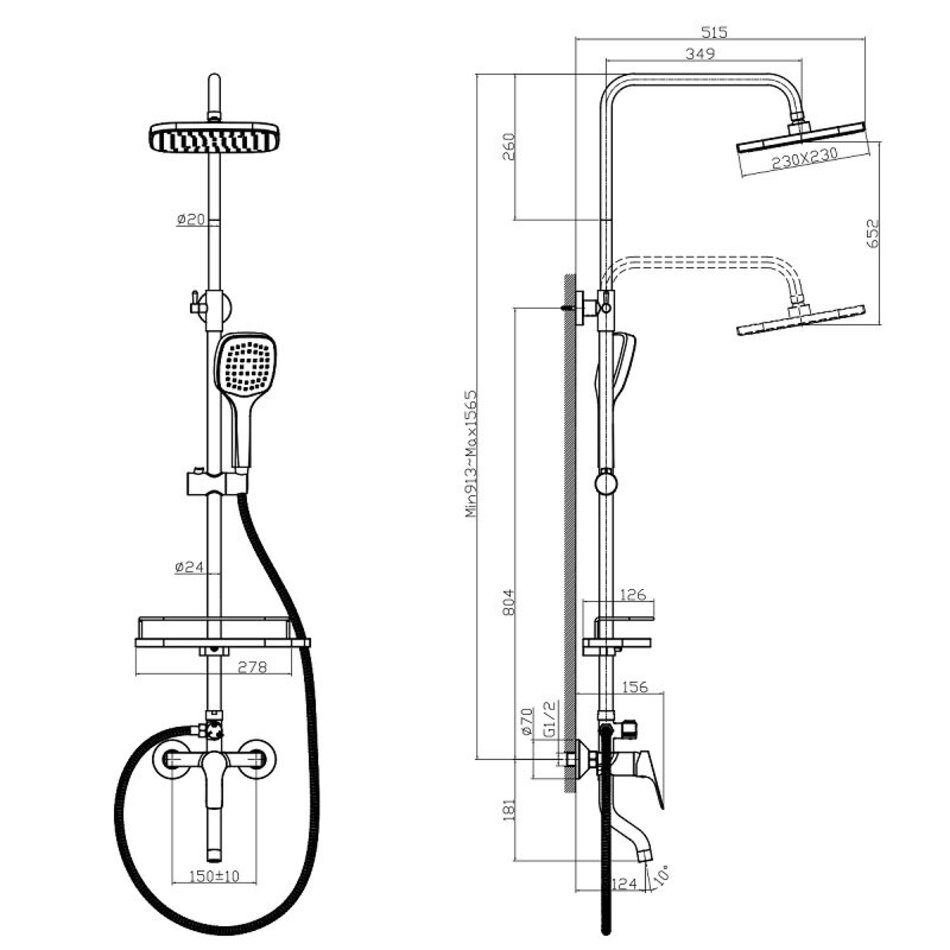 - Верхний душ: 23 x 23 см, поворотный, прямоугольный