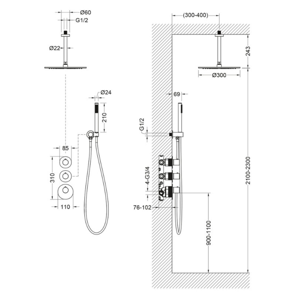 Регулировка температуры воды осуществляется ручкой термостата (расположена снизу). Включение режима "тропический душ" и регулировка напора осуществляется поворотом ручки дивертора (расположена сверху) влево. В положении ручки дивертора 12:00 режим "тропический душ" выключен. Для переключения в режим "ручной душ" поверните ручку дивертора (расположена по центру) от 12:00 против часовой стрелки.