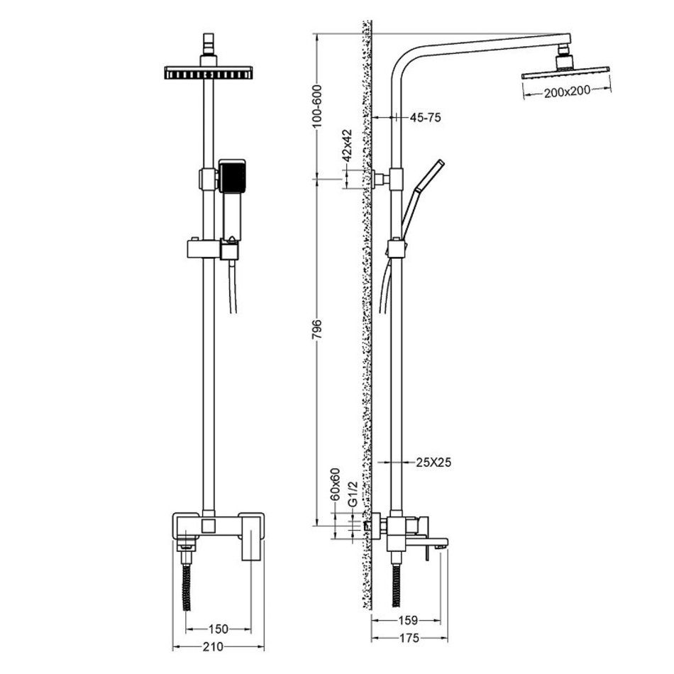 - Размер верхнего душа: 200 x 200 мм