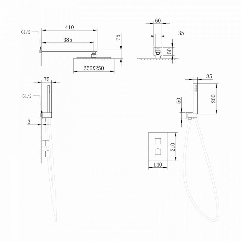 - Верхний душ: 25 x 25 см, квадратный