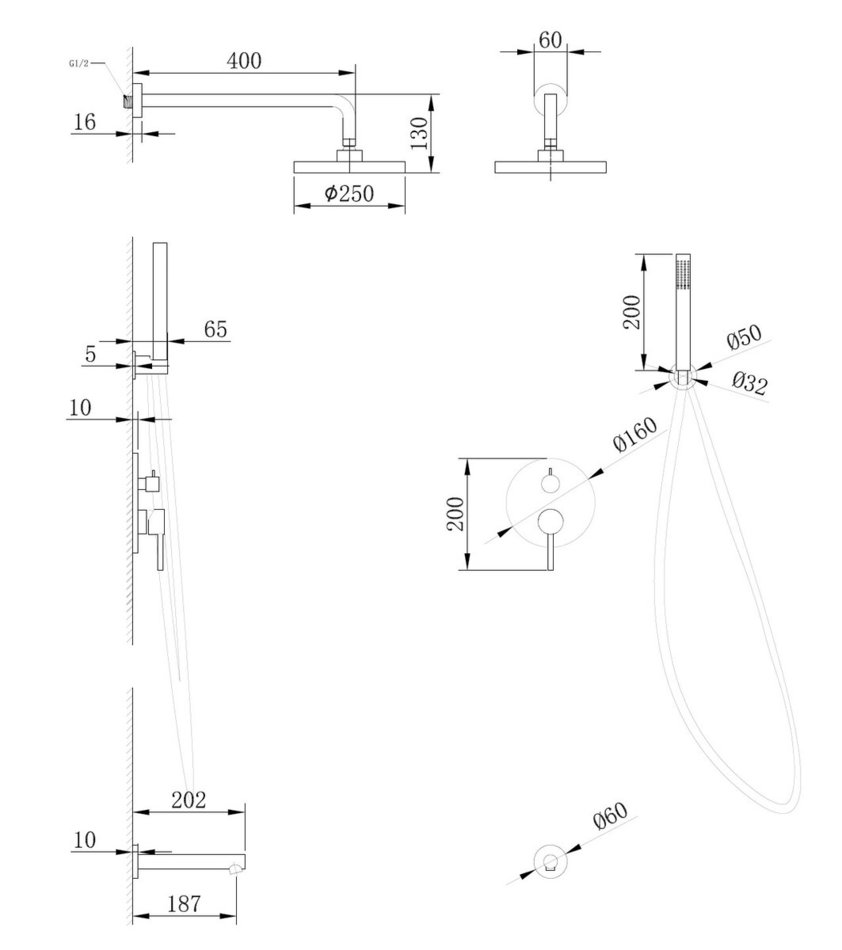 - Верхний душ: 25 x 25 см, круглый