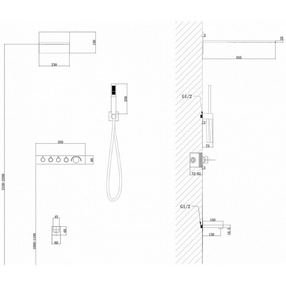 - Размер верхнего душа (ШхД): 230х555 мм.