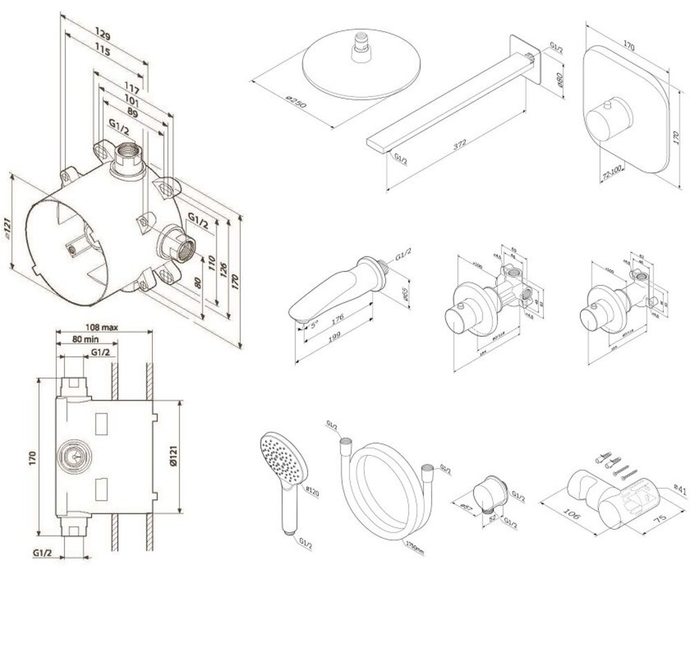 Состав поставки: смеситель, излив, верхний душ, держатель, душевой набор (лейка, душевой шланг, настенный держатель), шланговое присоединение, инструкция.