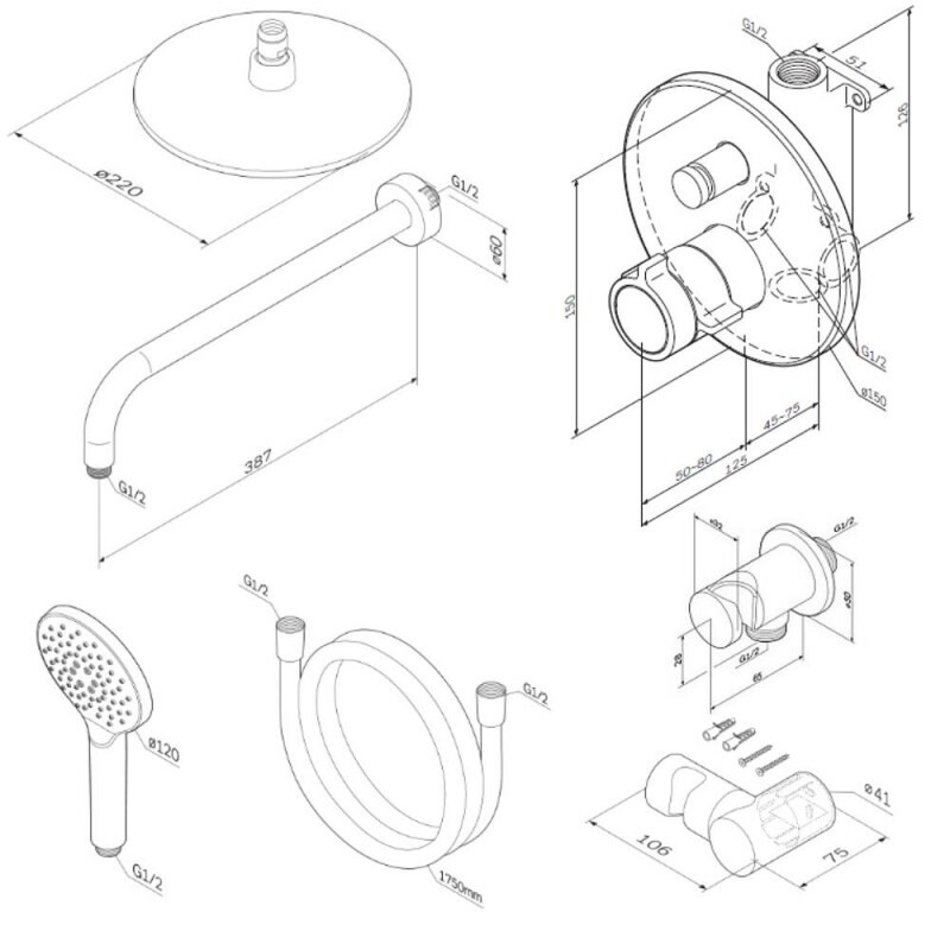 - Смеситель, встраиваемая часть смесителя, верхний душ, ручной душ, шланговое подсоединение, шланг, держатель верхнего душа, инструкция