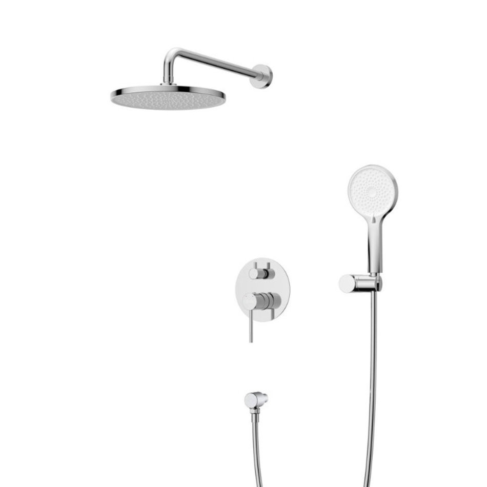 - Оснащение: встраиваемый смеситель с переключателем на два выхода, верхний душ с кронштейном, ручной душ 3-х режимный со шлангом, штуцером и держателем