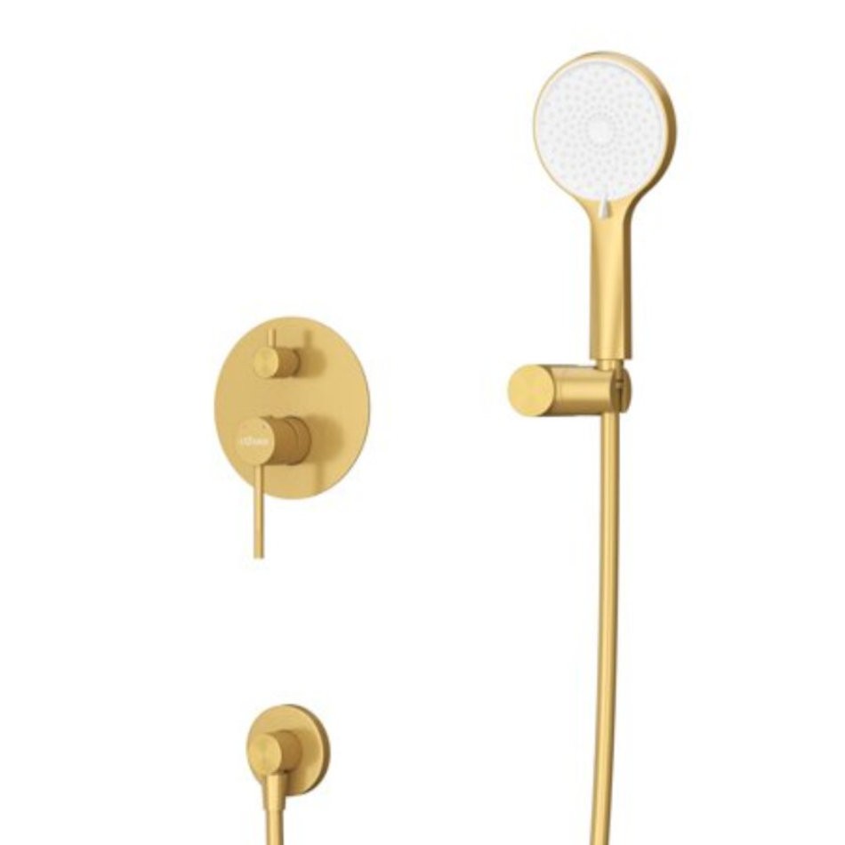 - Оснащение: встраиваемый смеситель с переключателем на два выхода, верхний душ с кронштейном, ручной душ 3-х режимный со шлангом, штуцером и держателем