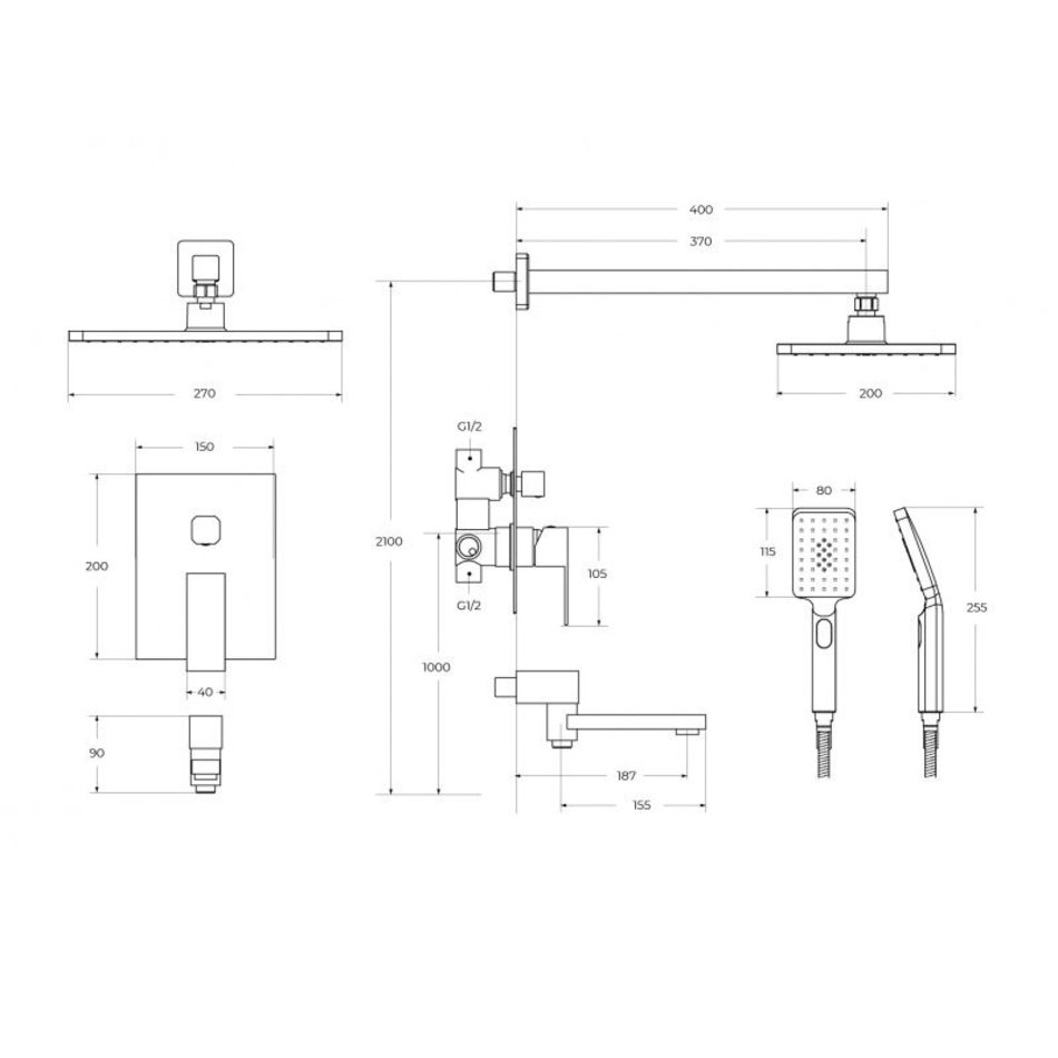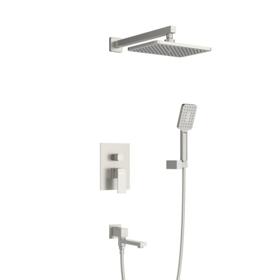 - Оснащение: встраиваемый смеситель с переключателем на три выхода, верхний душ с кронштейном, излив для ванны, ручной душ 3-х режимный со шлангом, штуцером и держателем