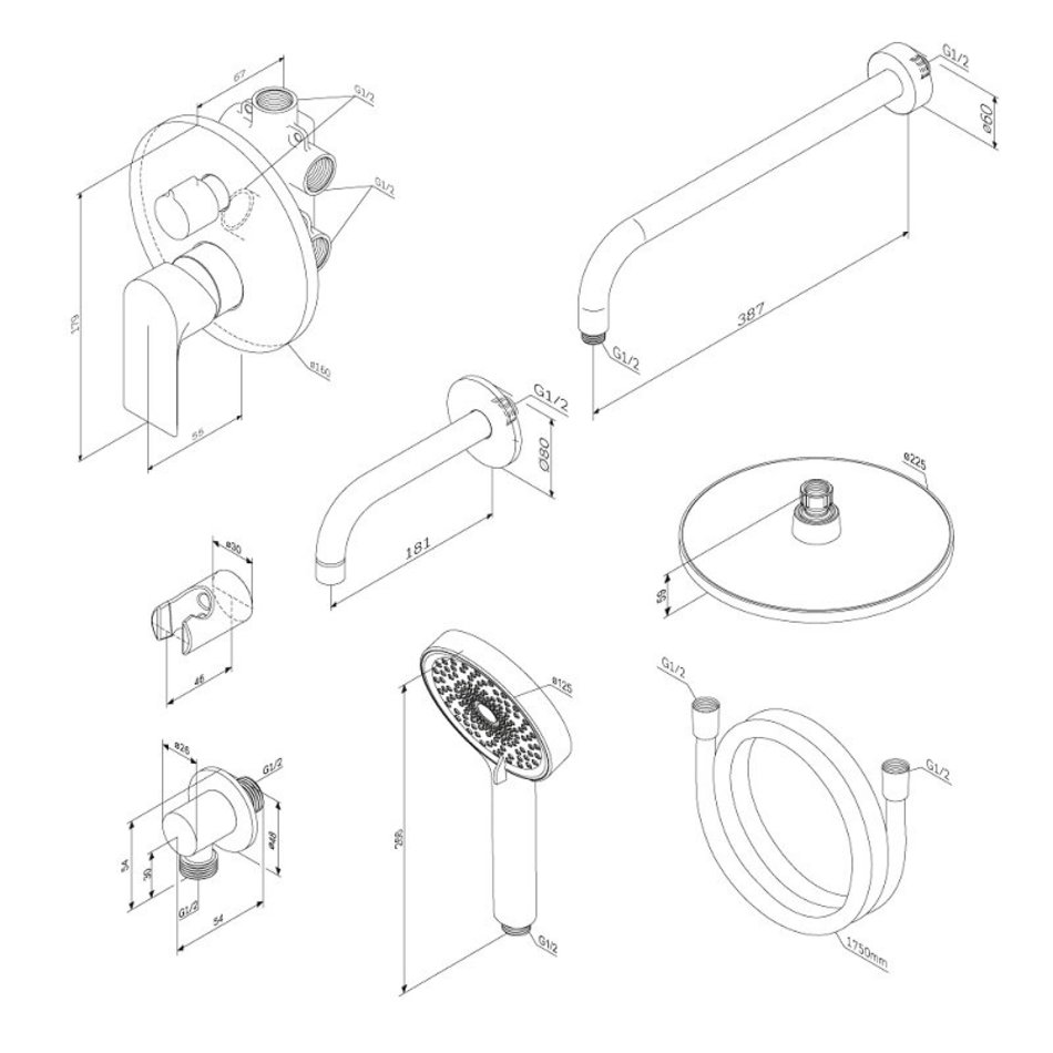 - смеситель (латунная внутренняя часть, наружная часть - декоративная тарелка), ручной душ, держатель для ручного душа с комплектом крепежей, верхний душ, держатель для верхнего душа, шланговое подсоединение, шланг, излив, инструкция.