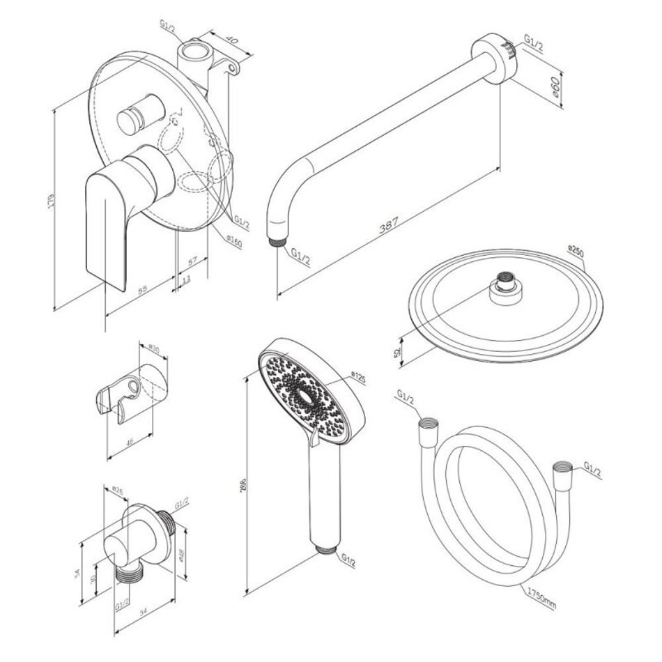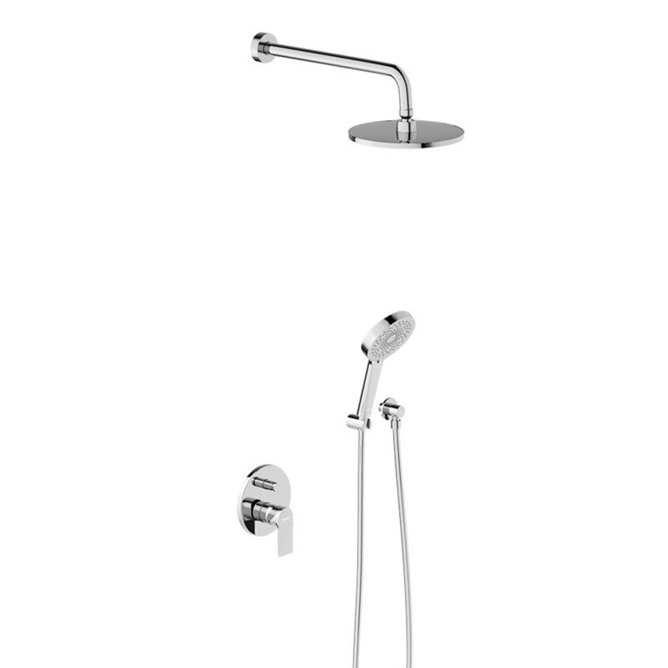 Комплект поставки: верхний душ, ручной душ, держатель ручного душа, держатель верхнего душа, шланг, смеситель (латунная внутренняя часть, наружная часть - декоративная тарелка), комплект креплений, инструкция.