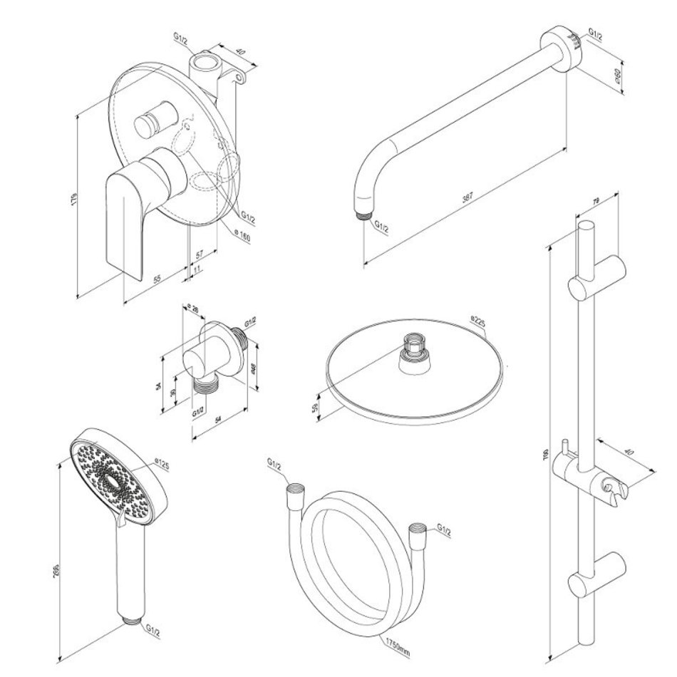 - смеситель (латунная внутренняя часть, наружная часть - декоративная тарелка), ручной душ, держатель для ручного душа с комплектом крепежей, верхний душ, держатель для верхнего душа, шланговое подсоединение, шланг, штанга, инструкция)