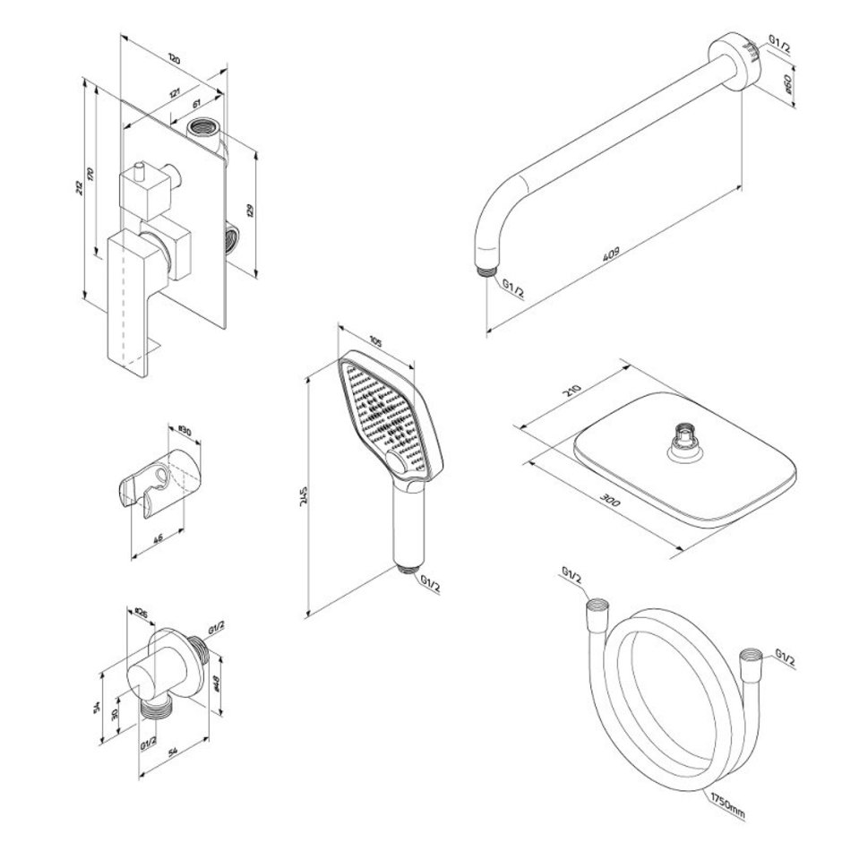 - смеситель (латунная внутренняя часть, наружная часть - декоративная тарелка), ручной душ, держатель для ручного душа с комплектом крепежей, верхний душ, держатель для верхнего душа, шланговое подсоединение, шланг, излив, штанга, инструкция