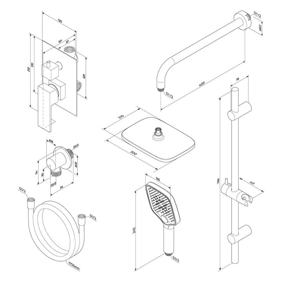 - Смеситель (латунная внутренняя часть, наружная часть - декоративная тарелка), ручной душ, держатель для ручного душа с комплектом крепежей, верхний душ, держатель для верхнего душа, шланговое подсоединение, шланг, штанга, инструкция