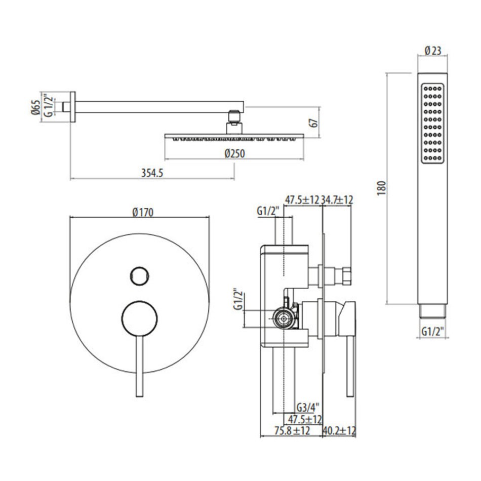 Комплектация: верхний душ, внутренняя часть смесителя, душевая лейка, настенный держатель, смеситель, шланг для душа.