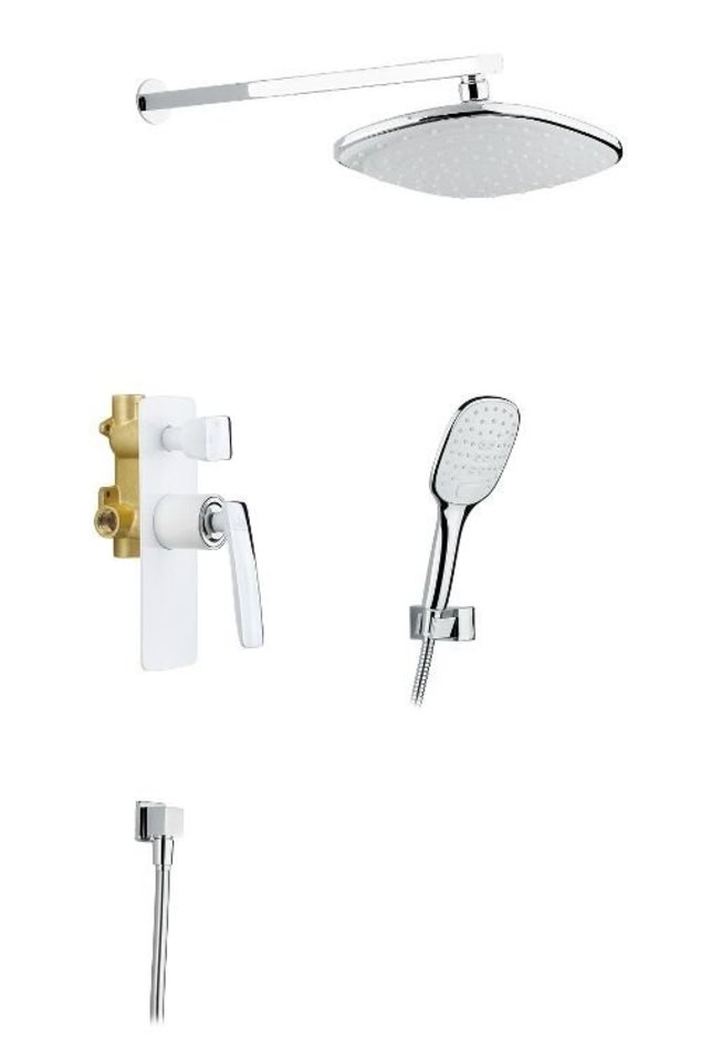 - Комплектация: смеситель скрытого монтажа, ручной душ, шланг, верхний душ