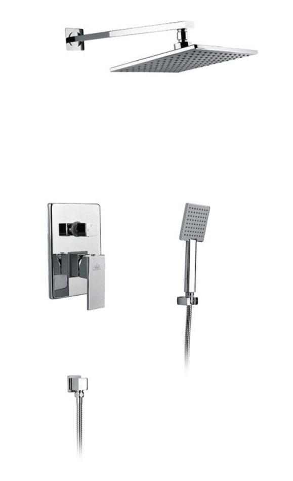 - Комплектация: смеситель скрытого монтажа, ручной душ, шланг, верхний душ