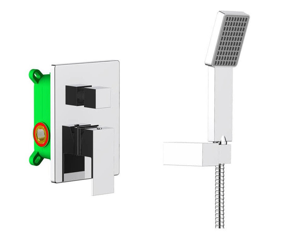 - Комплектация: смеситель скрытого монтажа, излив, ручной душ, шланг, верхний душ